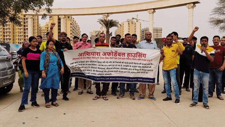 ||Delhi||Nancy Kaushik||साइबर सिटी में एक घर हो अपना बन कर रह गया सपना। दरअसल साइबर सिटी के सेक्टर-37 में बिल्डर ने आशियारा अफोर्डेबल हाउसिंग सोसायटी बनाने के लिए बुकिंग शुरू की थी। खरीदारों की माने तो 2018 मे उन्होंने अपने घर का सपना साजो कर आशियाना सोसायटी में पैसा लगा दिया था। साढ़े चार साल बीतने के बाद भी न तो फ्लैट ही मिल है और न ही मिलने की उम्मीद है। जबकि विल्डर ने बुकिंग के समय 2021 मे सोसायटी कम्प्लीट करने और पोजेशन देने की बात कही थी लेकिन अभी तक 60 प्रतिशत ही काम पूरा हुआ है। ऐसे में फ्लैट कब तक मिलेंगे कहना मुश्किल है। इसी को लेकर खरीददार सोसायटी के बाहर प्रदर्शन कर रहे है।