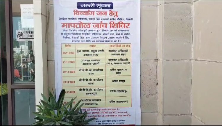 दिव्यांगो के लिए रेड क्रॉस सोसाइटी द्वारा SDM ऑफिस में कैंप का आयोजन किया गया ! इस बारे में जानकारी देते हुए रेड क्रॉस सोसाइटी के कार्यक्रम अधिकारी ने कहा कि अंबाला कैंट में रेड क्रॉस सोसाइटी द्वारा अंबाला उपायुक्त के अध्यक्षता में दिव्यांगजनों के चांस सीवर लगाया गया जिसमे कान की मसीन , तिपहिया साइकिल , वील चेयर , मोटर साइकिल वितरण करने के लिए असेसमेंट कैंप लगाया गया ! उन्होंने कहा की भारत सरकार द्वारा ये सारा सामान हमारे पास आ जायेगा ! उन्होंने कहा कि जहां जहां ये कैंप लगाए जा रहे है वहां इनको वितरण किया जायेगा ! उन्होंने कहा की जिला रेड क्रॉस सोसाइटी का प्रयास है कि अगर किसी दिव्यांग का कोई डाकुमेंट कम है जैसे इस उपकरण के लिए चार डाकूमेंट जरूरी है जैसे आधार कार्ड, परिवार पहचान पत्र , विकलांगता कार्ड , यूरी आई कार्ड ! उन्होंने कहा की यूरी आई कार्ड ज्यादा तर लोगो पे है नहीं उसकी लिए प्रशासन ने स्पेशल कंप्यूटर ऑपरेटर यहां पर बिठाया है ताकि यूरी आई कार्ड देकर लोगो को यूरी आई कार्ड देकर सारी फार्मेल्टी पूरी कर अधिक से अधिक उपकरण लोगो को दे सकें ! उन्होंने कहा कि कल हमारा अंबाला सब डिवीजन में कैंप था जिसमे हमने 75 लोगो को रिजिस्टर किया है और मुझे नहीं लगता की कोई व्यक्ति बिना असेसमेंट के गया है ! उन्होंने कहा कि कल दो लोगों का यूरी आई कार्ड न होने के कारण आज उनको यहां बुलाया गया है ! इसके साथ ही उन्होंने सभी सरपंचों , MC और लोगों से अपील करते हुए कहा कि अपने आस पास जो भी दिव्यांग है उनको जागरूक करने का काम करे और जैसे कल साहा में है परसो बराडा में है उसके बाद नारायणगढ़ में है और फिर शहजादपुर में कैंप का आयोजन किया जा रहा है उसमे आने के लिए कहे ताकि कोई भी दिव्यांगजन इस उपकार से वंचित न रह पाए !