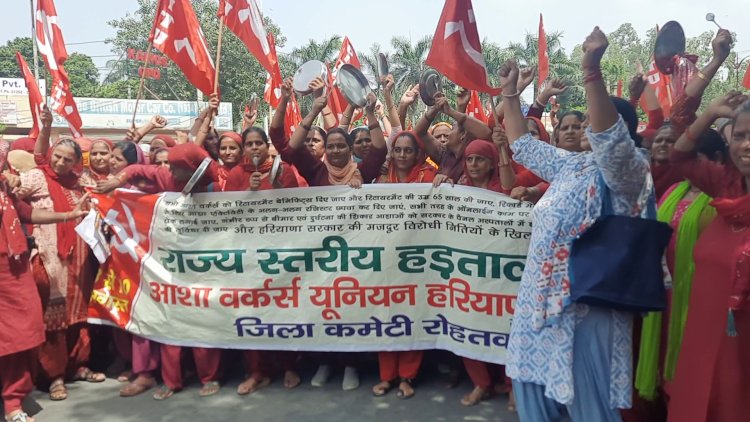 रोहतक || प्रदेश भर में आशा वर्कर पिछले 21 दिनों से हड़ताल पर हैं आज रोहतक में शहर में आशा वर्करों ने थालियां बजाकर प्रदर्शन किया है । रोहतक जिला की आशा वर्कर की प्रधान अनीता का कहना है कि हरियाणा की गूंगी बहरी सरकार को अपनी आवाज सुनने के लिए उन्होंने शहर में थालिया बजाकर प्रदर्शन किया है। पिछले 21 दिनो से प्रदेश के सभी जिला मुख्यालय पर वह धरना प्रदर्शन कर रही है लेकिन सरकार ने उनसे बात करने की जे जहमत तक नहीं उठाई है। उन्होंने सरकार को चेतावनी दी कि जब तक सरकार उन्हें सरकारी कर्मचारी का दर्जा नहीं देगी और उनका वेतनमान 26000 नहीं करेगी। वे तब तक अपना धरना प्रदर्शन जारी रखेंगी । प्रत्येक आशा वर्कर को ₹4000 मासिक वेतन मिलता है जबकि वह पूरा दिन काम करती हैं सरकार द्वारा दिए जाने वाले ₹4000 में उनके परिवार की थाली खाली रहती है। उन्होंने कहा कि आज प्रदेश की सभी आशा वर्कर विधानसभा पर प्रदर्शन करना चाहती थी लेकिन सरकार ने पुलिस के द्वारा उनकी सभी नेताओं को नजर बंद कर दिया है इसलिए आशा वर्कर आज हरियाणा विधानसभा पर प्रदर्शन नहीं कर पाई ।वह सरकार से कहना चाहती है की सरकार चाहे कितने भी हथकंडे क्यों ना अपना ले वह अपना हक लेकर रहेगी ।