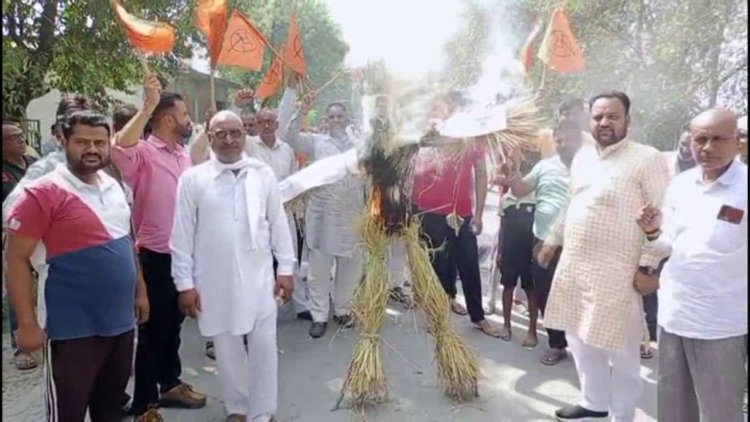भारतीय किसान संघ ने यमुनानगर- गुमथला रोड जाम कर उपमुख्यमंत्री का पुतला फूंका