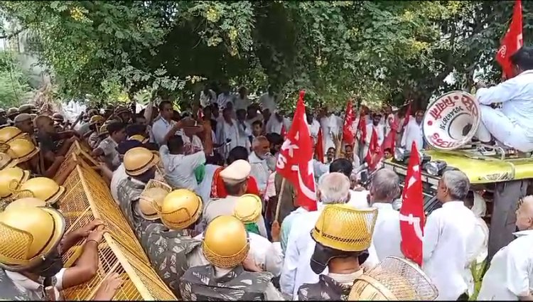 भिवानी || अखिल भारतीय किसान सभा हरियाणा के आह्वान पर प्रदेश भर के किसान अपनी 14 सूत्रीय मांगों को लेकर बुधवार को भिवानी में उपायुक्त कार्यालय एकत्रित हुए तथा बकाया बीमा क्लेम, मुआवजा, बाढ सूखे के मुआवजे, नहरों में पानी व पर्याप्त बिजली व अन्य मांगो को लेकर शहर में प्रदर्शन करते हुए कृषि मंत्री के आवास पर पहुंचे तथा कृषि मंत्री के आवास का घेराव किया। इस दौरान समय देने के बाद भी कृषि मंत्री निवास पर नहीं मिले तो किसानों का गुस्सा ओर भी बढ़ गया तथा उन्होंने वहां पर जमकर नारेबाजी की। बता दे कि भिवानी में कृषि मंत्री के आवास के पास पुलिस प्रशासन ने बड़े बैरिकेड लगा रखे थे। वहीं दो घंटे तक पुलिस और किसानों के बीच काफी तू तड़ाक व झडप हुई फिर एसडीएम बाबूलाल दीपक कारवा ने कृषि मंत्री से बातचीत के लिए एक सितंबर की तिथि तय करके किसानों का ज्ञापन लिया। इस दौरान किसानों ने नहरों में पर्याप्त पानी देने, गांव में पीने के पानी उपलब्ध कराने, बिजली कटौती बंद करने व लंबित पड़े ट्यूवैल कन्कशैन देने की मांग की। उन्होंने बताया कि मांग व मुद्दों को लेकर 24 अगस्त को दिल्ली में किसान मजदूरों की राष्ट्रीय कन्वेशन होगी।