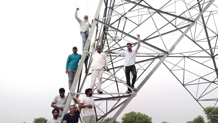 मुआवजे की मांग को लेकर हाईटेंशन बिजली लाइन के टावर पर चढ़े किसान
