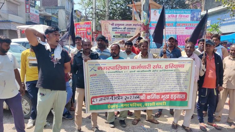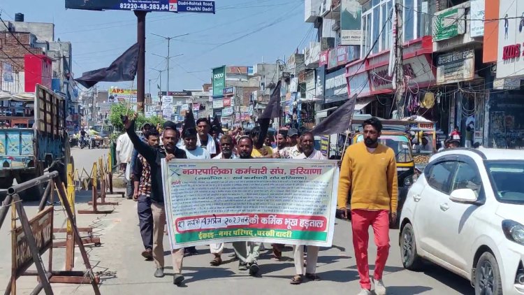 चरखी दादरी (प्रदीप साहू )|| नगर परिषद के कर्मचारी 27 मार्च से भूख हड़ताल पर हैं यह भूख हड़ताल 4 अप्रैल 2023 तक रहेगी यदि सरकार के द्वारा इनकी लंबित मांगे पूरी नहीं किया गया तो राज्य कमेटी के द्वारा मीटिंग करके जो फैसला लिया जाएगा उसके अनुसार दादरी नगर परिषद कर्मचारी भी उनके फैसले के अनुसार आगामी कार्रवाई करेंगे । कर्मचारियों ने सरकार को स्पष्ट शब्दों में चेतावनी दी कि अगर कौशल रोजगार निगम को खत्म नहीं किया और मांगें पूरी नहीं तो फिर से अनिश्चितकालीन हड़ताल पर चले जाएंगे। इस बार की हड़ताल दूसरे विभागों के कर्मचारियों के साथ मिलकर करेंगे और आर-पार की लड़ाई लड़ेंगे। नप कर्मियों ने हड़ताल के दौरान काले झंडों व उल्टी झाड़ू के साथ शहर में रोष प्रदर्शन किया।