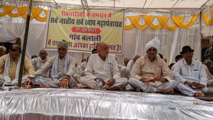 चरखी दादरी के गांव बलाली के सरकारी स्कूल में ग्राम पंचायत द्वारा सांगवान खाप की अगुवाई मंे सर्वजातीय सर्वखाप महापंचायत आयोजित की गई। महापंचायत में सांगवान, श्योराण, फोगाट, पंवार, हवेली, सतगामा सहित दर्जनभर खापों के अलावा किसान व सामाजिक संगठनों के प्रतिनिधि भी पहुंचे। गांव के सरपंच बिंदराज द्वारा पंचायत का संचालन शुरू करवाते हुए सांगवान खाप के प्रधान व विधायक सोमबीर सांगवान की अध्यक्षता मंे करीब चार घंटे तक रेसलरों के मसले पर मंथन किया गया। रेसलरों की केंद्रीय मंत्री अनुराग ठाकुर से दिल्ली में मुलाकात के बीच खाप चौधरियों ने 21 सदस्यीय कमेटी बनाकर 6 फैसलों पर मोहर लगाई। हालांकि गांव की रेसलर विनेश व संगीता फोगाट महापंचायत में नहीं पहुंची। वहीं द्रोणाचार्य अवार्डी महाबीर पहलवान व विनेश के भाई हरविंद्र फोगाट की उपस्थितिथि में खाप ने बेटियों को न्याय दिलवाने के लिए आर-पार की लड़ाई का ऐलान किया।