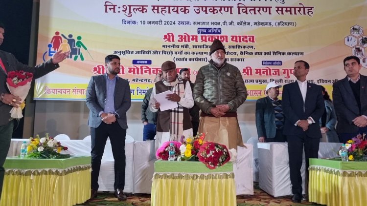 महेंद्रगढ़ के राजकीय कॉलेज के सभागार में दिव्यांगजनों को बैटरी चलित तिपहिया साइकिल व सहायक उपकरण वितरण कार्यक्रम आयोजित किया गया। जिला रेडक्रॉस समिति की ओर से आयोजित इस जिला स्तरीय कार्यक्रम में भारतीय कृत्रिम अंग निर्माण द्वारा भारत सरकार के सामाजिक न्याय एवं अधिकारिकता मंत्रालय के तत्वाधान में 250 दिव्यांगजनों को बैटरी चलित तिपहिया साइकिल व सहायक उपकरण दिए गए। इसके लिए भारत सरकार की इंडियन ऑयल कॉरपोरेशन लिमिटेड के सीएसआर योजना के सौजन्य से लगभग 60 लाख रुपए खर्च किए गए हैं।इस कार्यक्रम मे सामाजिक न्याय एवं अधिकारिता मंत्री ओम प्रकाश यादव ने मुख्यातिथि के रूप मे शिरकत की वही कार्यक्रम की अध्यक्षता पूर्व शिक्षा मंत्री रामबिलास शर्मा ने की।