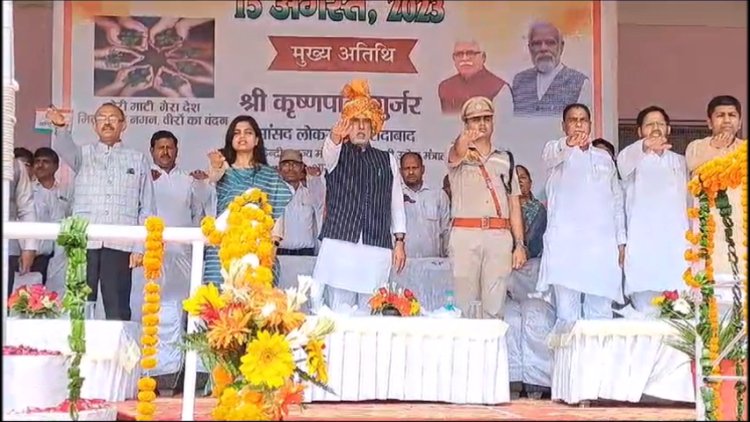 पलवल में केंद्रीय ऊर्जा मंत्री कृष्णपाल गुर्जर ने ध्वजारोहण किया