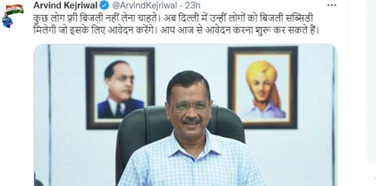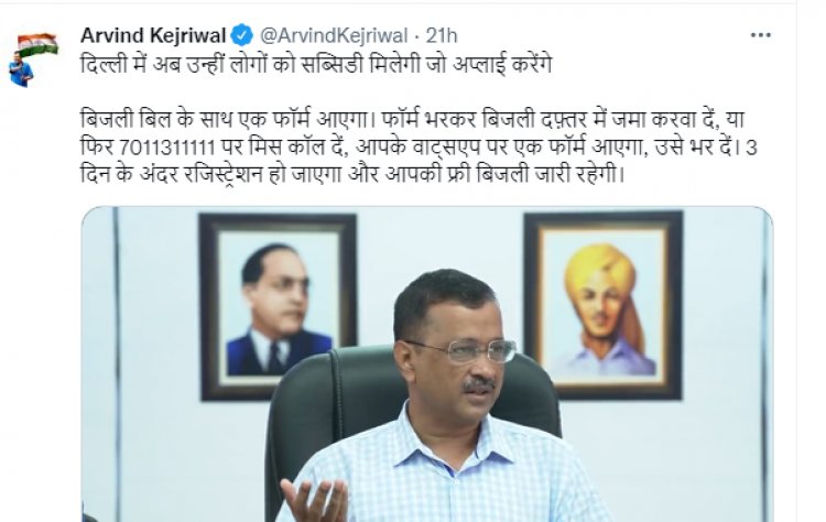 मुख्यमंत्री केजरीवाल ने ट्वीट भी किया की कुछ लोग फ़्री बिजली नहीं लेना चाहते। अब दिल्ली में उन्हीं लोगों को बिजली सब्सिडी मिलेगी जो इसके लिए आवेदन करेंगे। और इसके लिए आप आज से आवेदन करना शुरू कर सकते हैं। साथ ही मुख्यमंत्री ने कहा की दिल्ली में अब उन्हीं लोगों को सब्सिडी मिलेगी जो अप्लाई करेंगे। बिजली बिल के साथ एक फॉर्म आएगा। फॉर्म भरकर बिजली दफ़्तर में जमा करवा दें, या फिर 7011311111 पर मिस कॉल दें, आपके वाट्सएप पर एक फॉर्म आएगा, उसे भर दें। 3 दिन के अंदर रजिस्ट्रेशन हो जाएगा और आपकी फ्री बिजली जारी रहेगी।